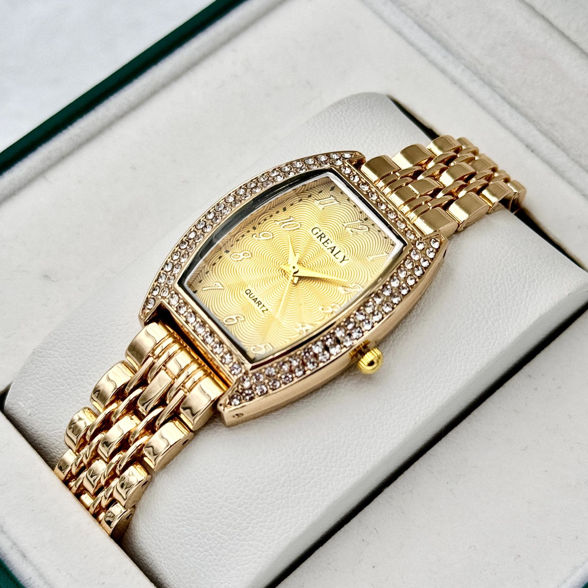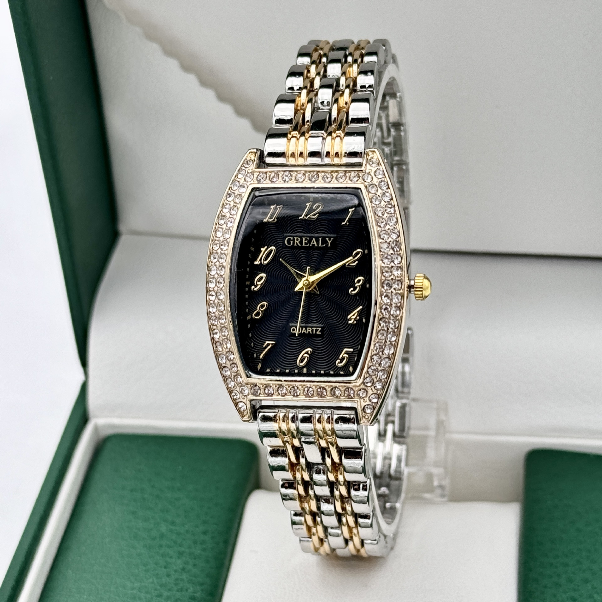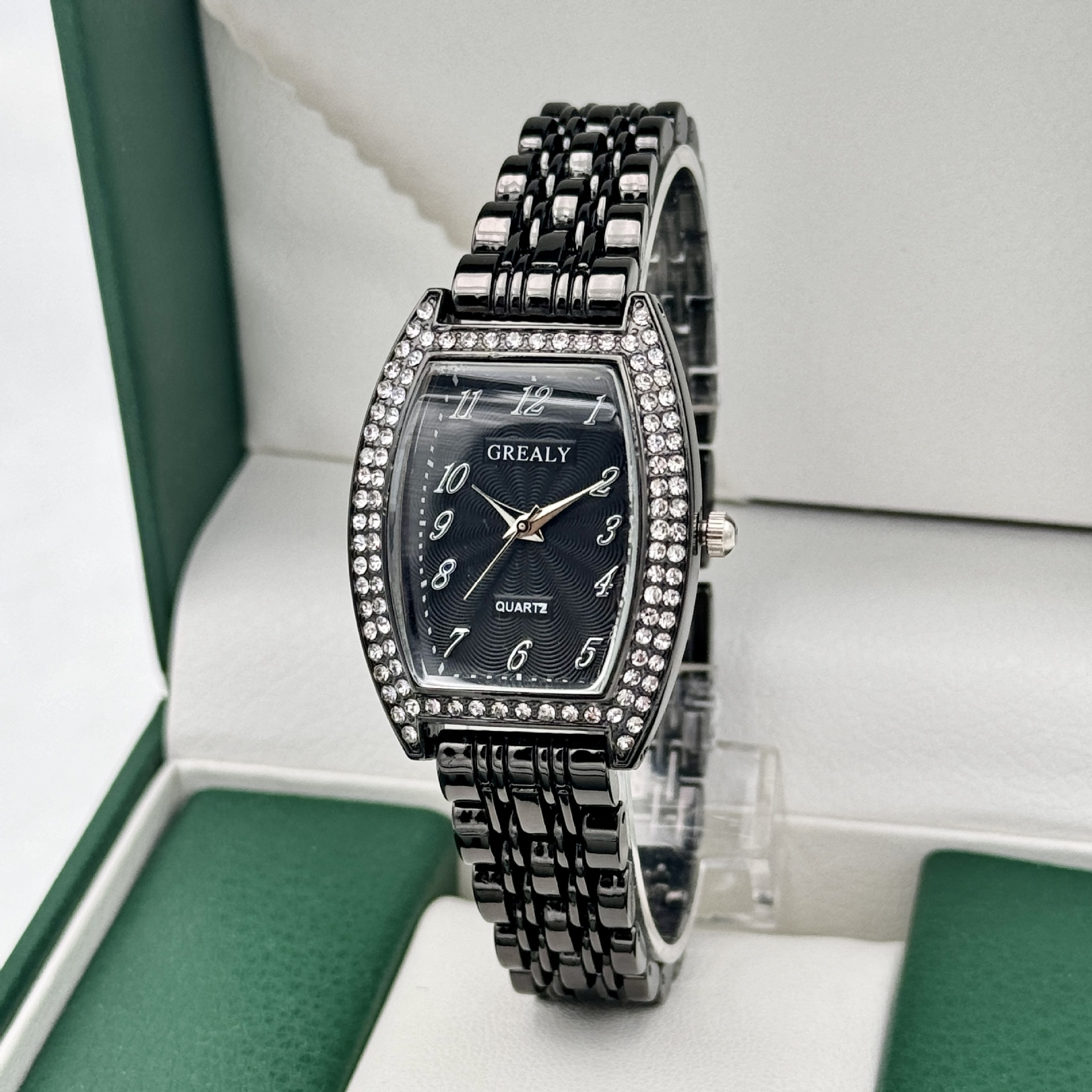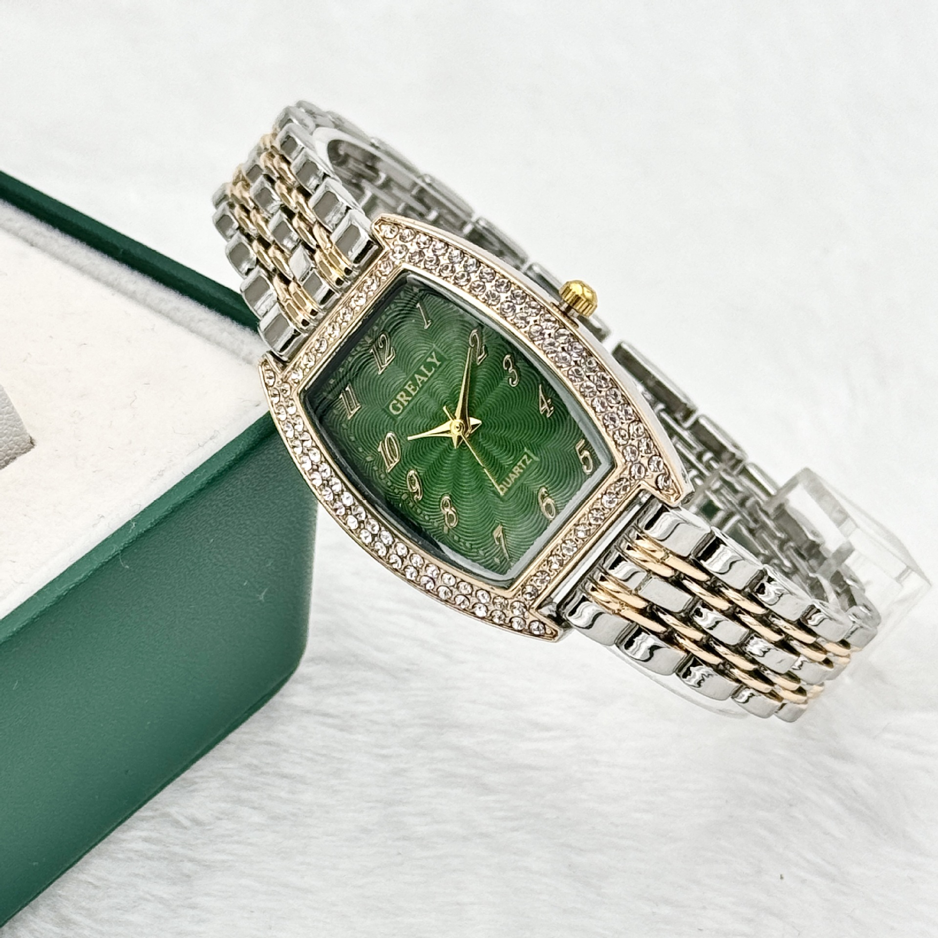 Reloj de cuarzo para mujer con esfera en forma de barril y pulsera de metal con incrustaciones de diamantes
