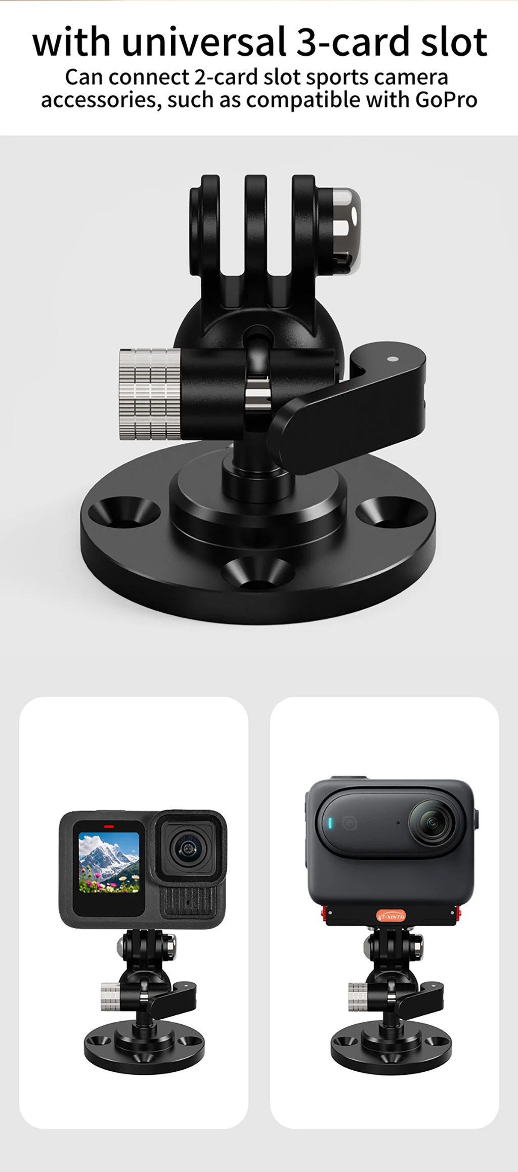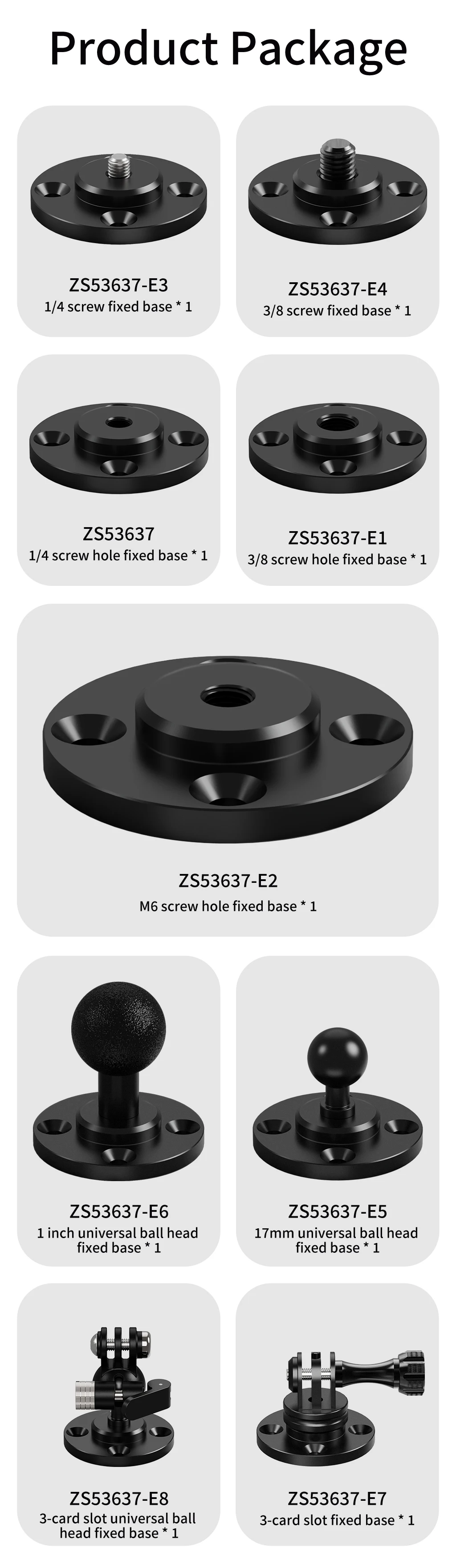 Universal Mounting Matrix: Choose from 8 connector types (1/4", 3/8", M6 threads / 17mm/25.4mm balls / Action cam clamps) to fit ANY accessory.