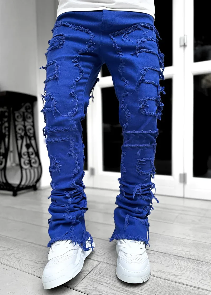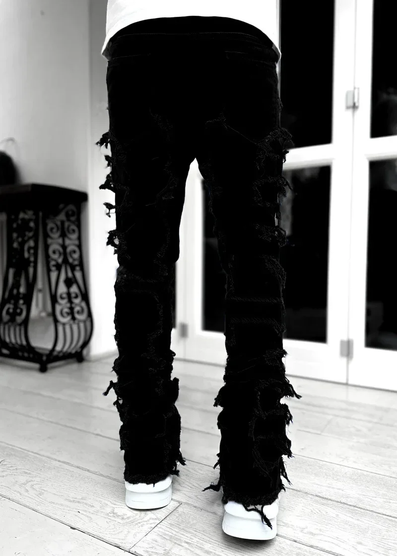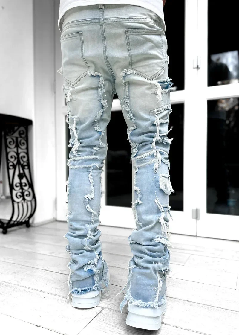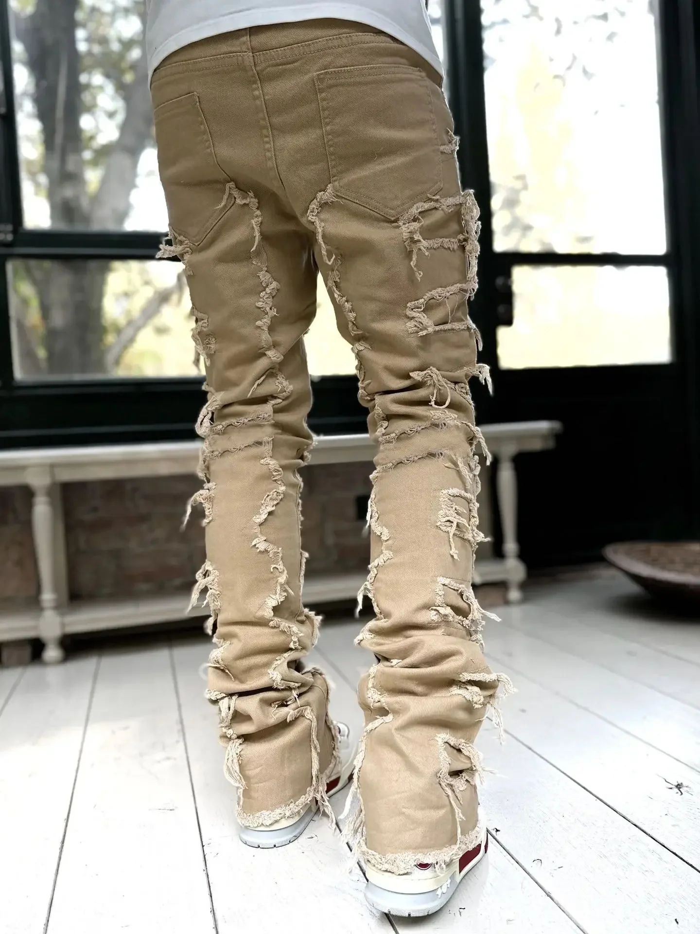Fashion Streetwear Men's Regular Fit Stacked Jeans Ripped Slim Fit Patch Distressed Destroyed Straight Denim Pants 2024 S-3XL