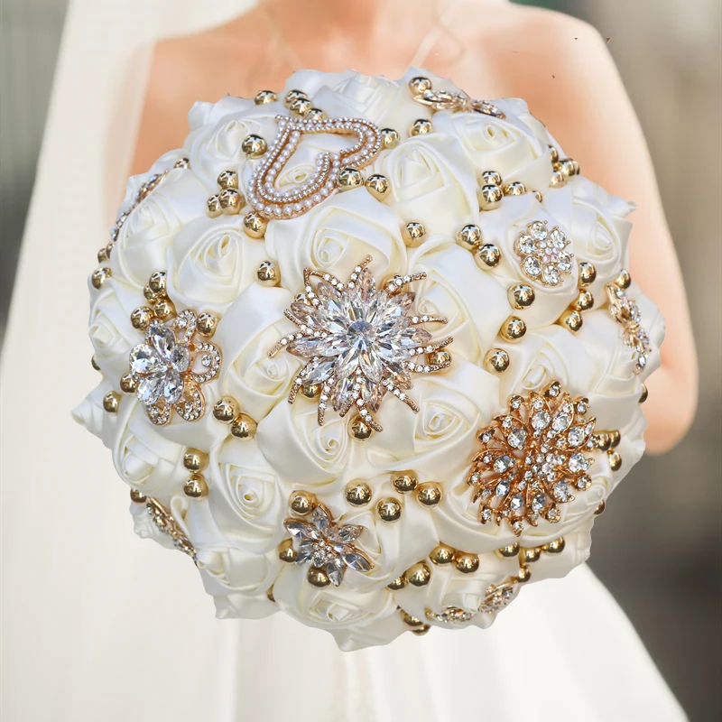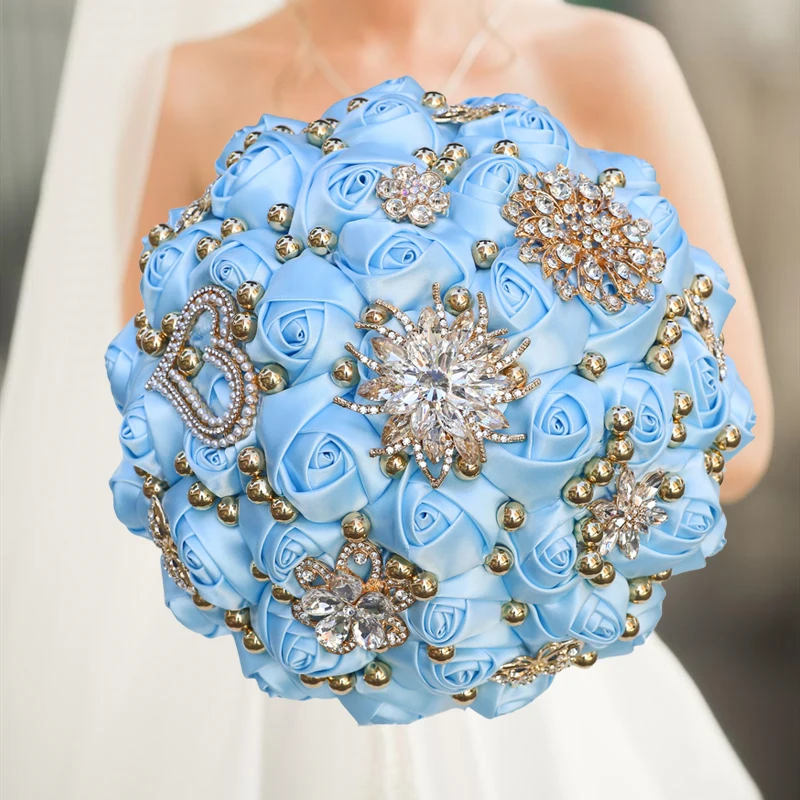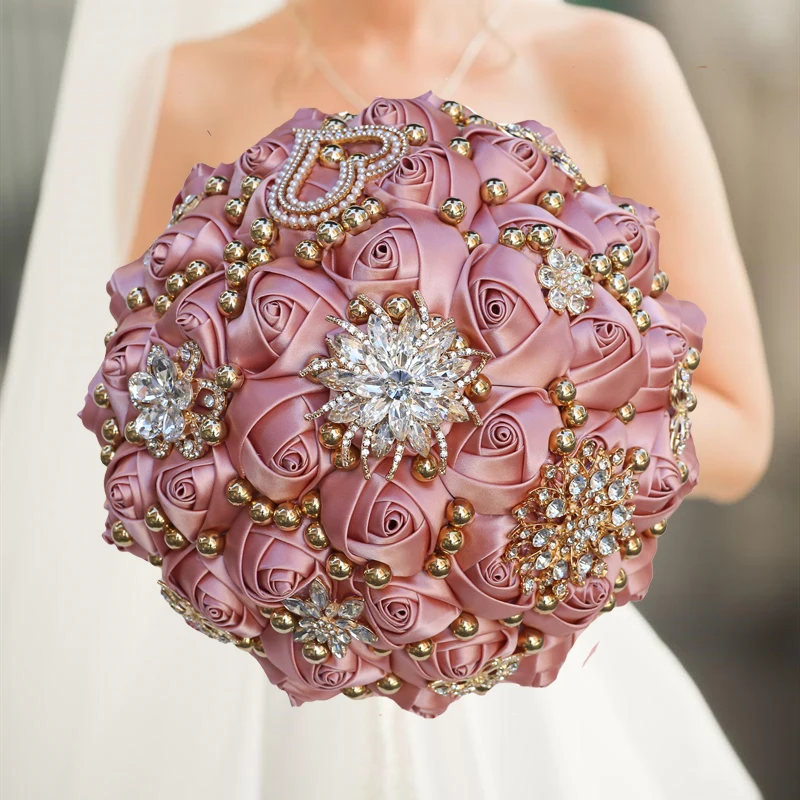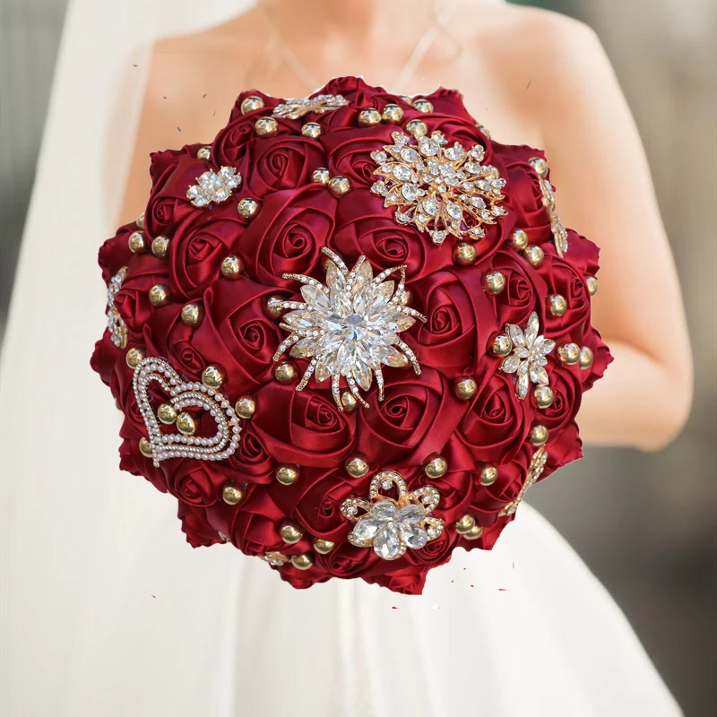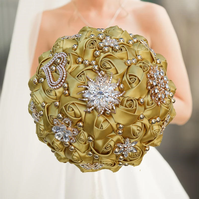 Green Rhinestone Brooch Wedding Bouquet for Bride Bridesmaid High Quality Ribbon Flowers Many Size and Colors
