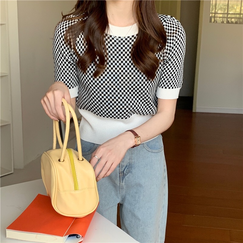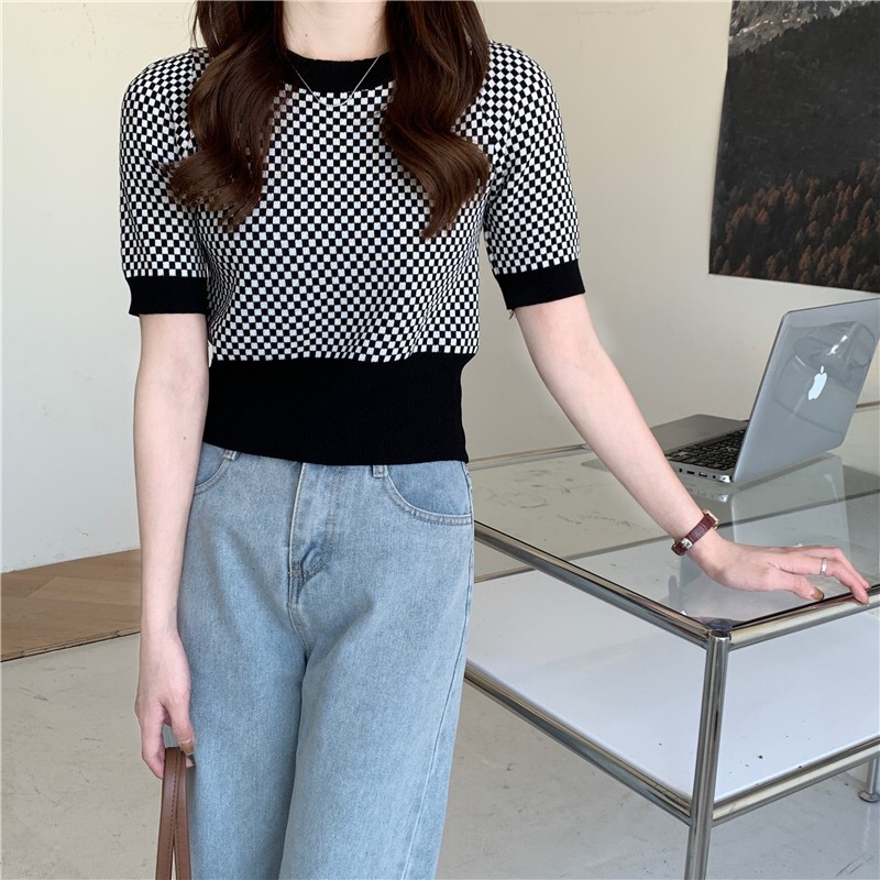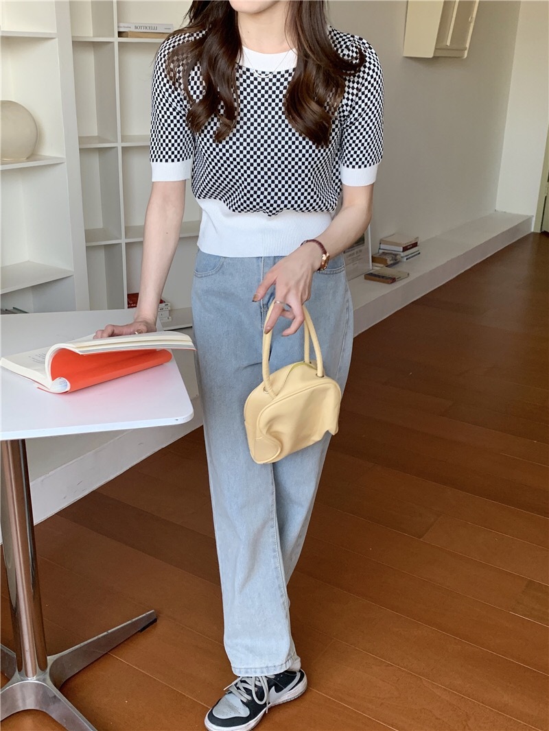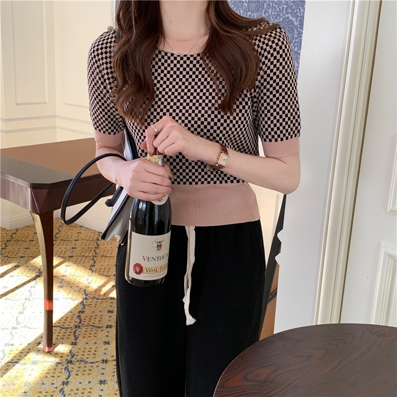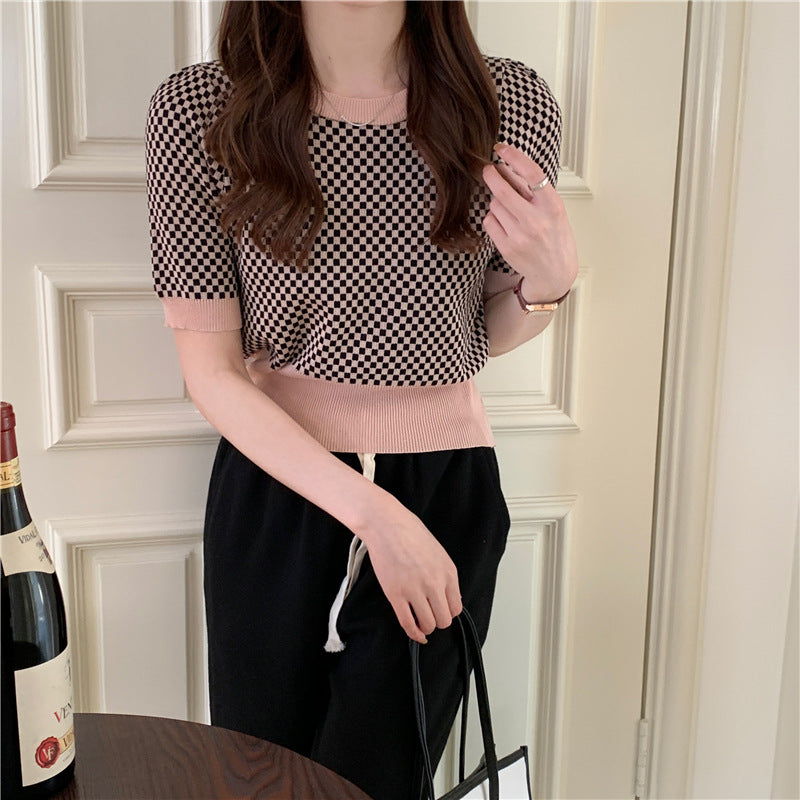 Womens Retro Plaid Color-Block Short-Sleeve Top